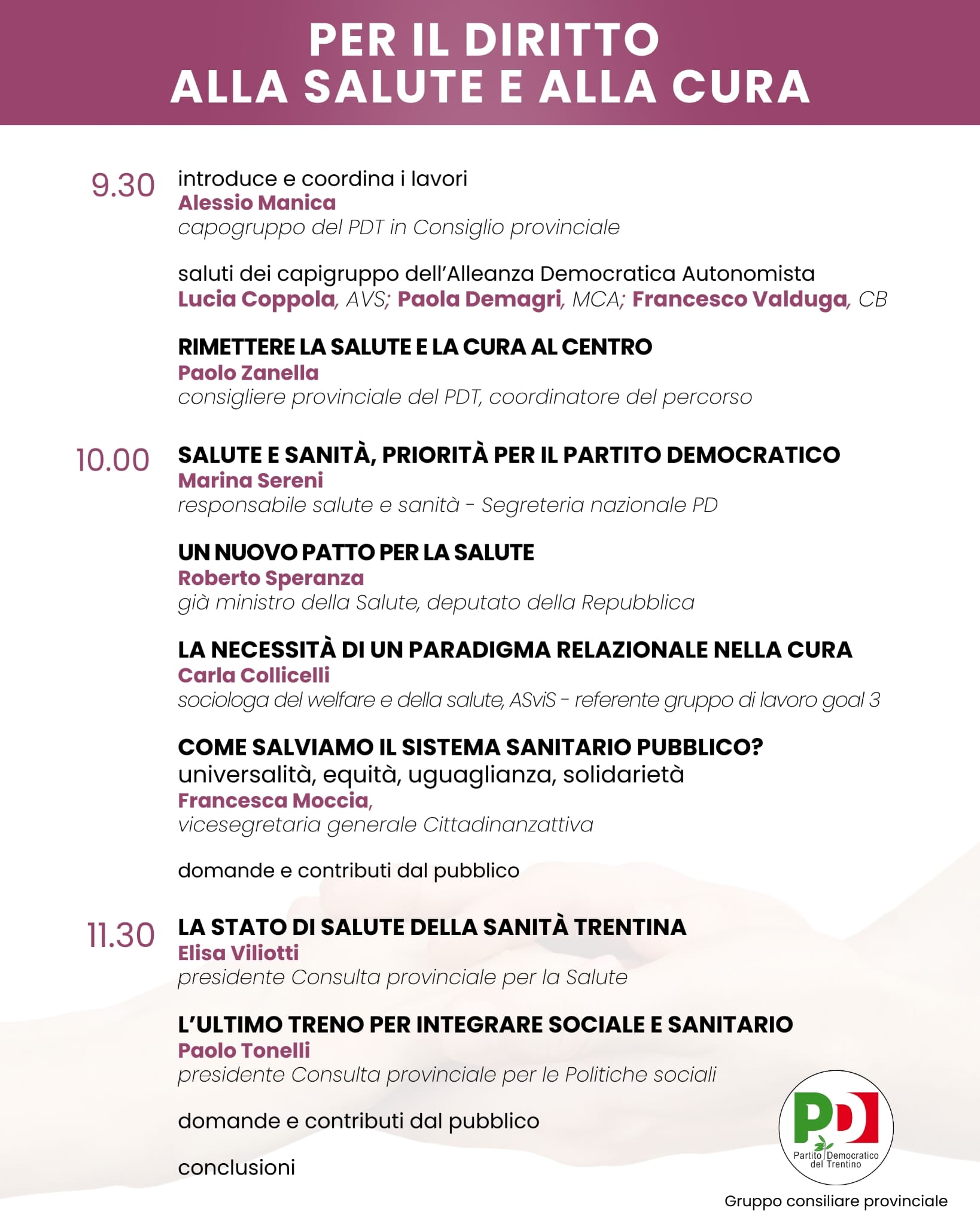 Sabato 28 marzo alle 9.30 presso la Sala di Rappresentanza della Regione a Trento il gruppo consiliare del Partito Democratico del Trentino ha organizzato un evento dedicato al “Diritto alla salute e alla cura” per approfondire assieme a politici e politiche, esperte ed esperti l’importante tema dell'accesso alla cure e della tutela della salute minati in tutto il Paese da una profonda crisi del welfare e del servizio sanitario pubblico.